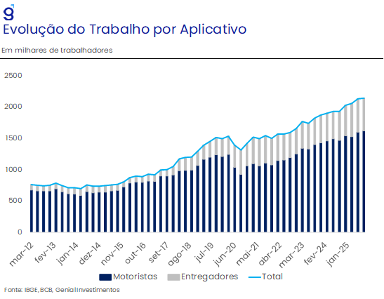 Em função desse descasamento entre políticas monetária e fiscal, esperamos que o mercado de trabalho arrefeça gradualmente, de modo que, a taxa de desemprego média do ano de 2026 deve se elevar em cerca de 0,3 p.p., refletindo principalmente a nossa expectativa de recuperação da taxa de participação ao longo do próximo ano. Contudo, devido ao elevado grau de incerteza em torno dos efeitos da política fiscal sobre a economia, o desempenho mais forte do mercado de trabalho nos últimos anos e por conta de mudanças estruturais no mercado de trabalho, avaliamos que há um viés baixista para essa nossa projeção. Em primeiro lugar, as políticas de transferência de renda podem impedir o avanço da taxa de participação. Além disso, o efeito estrutural da maior flexibilidade do mercado de trabalho decorrente do trabalho por aplicativo pode contribuir para que haja um menor contingente de desempregados. Em ambos os casos, o efeito é baixista para taxa de desemprego.