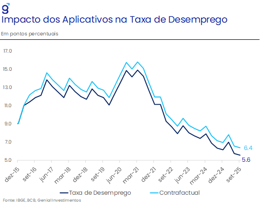 Cabe destacar que uma taxa de desemprego mais baixa não necessariamente implica em uma maior pressão inflacionária. Existem razões que podem fundamentar que o nível atual pode ser, ou não, inflacionário. Por um lado, os aplicativos de entrega e de transporte podem diminuir o desemprego e impulsionar a renda, ao mesmo tempo em que reduz o custo de casamento (matching) na formação de vagas, aumentando o produto da economia como um todo. Dessa forma, tem-se um aumento da oferta sendo simultaneamente acompanhada por um aumento da demanda. Estimamos que, na ausência do impacto dos aplicativos no mercado de trabalho, a taxa de desemprego encerraria o trimestre móvel de outubro em 6,4% ao invés de 5,6%.