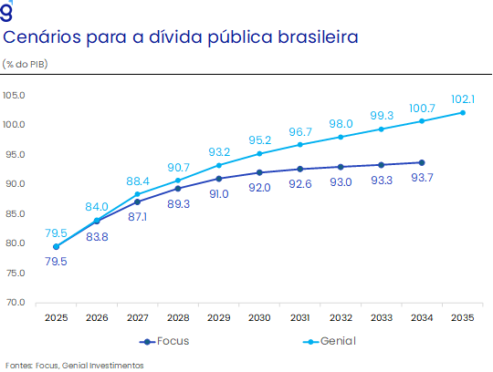 Além disso, o ajuste extremamente lento promovido pelo arcabouço fiscal deve fazer com que a trajetória da dívida permaneça ascendente ao longo dos próximos anos. De acordo com as nossas estimativas, dado o patamar esperado de taxa de juros real, inflação e crescimento da economia para o ano de 2026, o superávit necessário para estabilizar a dívida está entre 2,5-3,0% do PIB, significativamente acima do centro da meta fiscal de 0,25% do PIB. Diante de um nível já bastante elevado de resultado primário necessário para a estabilização da dívida, entendemos que isso só será possível através de um ajuste estrutural que busque atacar os principais problemas pelo lado das despesas (indexação do salário-mínimo, forte ritmo de crescimento de rubricas de transferência de renda e gastos previdenciários, inchaço do setor público, por exemplo), contribuindo com a queda das taxas longas, e consequentemente uma exigência menor de resultado primário necessário para estabilizar a dívida. Atualmente, não vemos nenhuma inclinação do atual governo a promover tal ajuste, ainda mais em ano eleitoral.