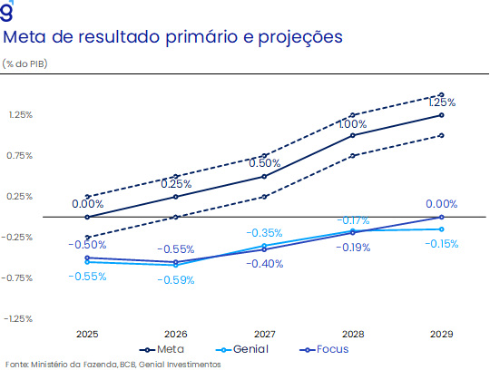 Outro fator determinante do cenário econômico em 2026 será o comportamento da política fiscal brasileira, tanto direto quanto indiretamente. A aprovação de medidas de aumento de arrecadação ao longo de 2025 (restrição de compensações tributárias, revisão no auxílio-doença, alterações no seguro-defeso, revisão de benefícios tributários, aumento das alíquotas de JCP e IOF, por exemplo) aumentam significativamente as chances do governo de cumprir a meta de resultado primário de superávit primário (0,25% do PIB), cuja faixa de tolerância inferior é de déficit zero.