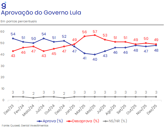 O ano de 2026 já se inicia em meio a um cenário de elevada incerteza decorrente de fatores domésticos e internacionais. No Brasil, destacamos a continuidade do processo de deterioração das contas públicas brasileiras desde o início do governo Lula III, cujo questionamento sobre a sustentabilidade da dívida deve manter o risco fiscal bastante elevado, e o ciclo eleitoral de 2026 que deve ser responsável por adicionar volatilidade às principais variáveis financeiras em função das incertezas em torno da corrida presidencial. No cenário internacional, os principais desafios incluem a agenda econômica do governo Trump, com a nomeação de um novo presidente do Fed que pode vir a priorizar o emprego em detrimento da inflação, as tensões geopolíticas globais e a continuidade do processo de desaceleração da economia chinesa.