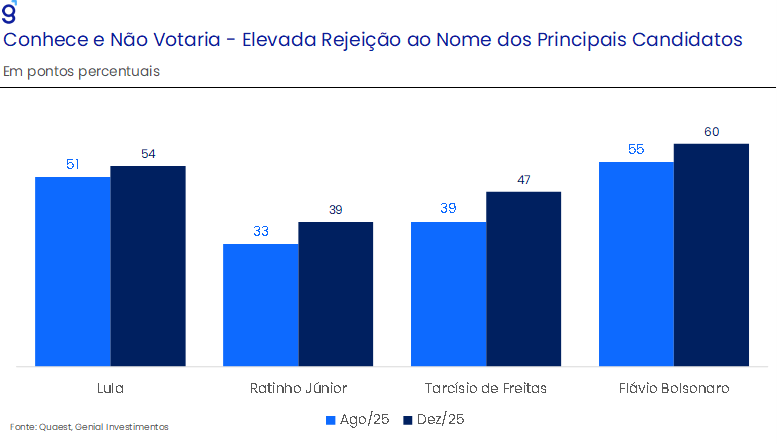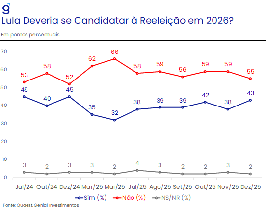 Em suma, a questão a ser observado ao longo do ano é: qual movimento se mostrará mais forte? A valorização do Real frente ao Dólar, devido à uma possível postura mais leniente do Fed ou o cenário político interno? O que sabemos é que a forte reação negativa dos investidores logo após o anúncio da candidatura de Flávio Bolsonaro à presidência no final do ano passado pode ser um sinal de como os investidores irão reagir caso as pesquisas confirmem maior probabilidade de reeleição do presidente Lula, se contrapondo ao movimento de perda de força do DXY em meio a falas mais dovish de diretores após a última reunião do FOMC de 2025.