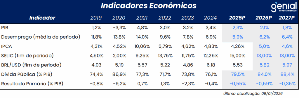 O ano de 2025 consolidou um quadro macroeconômico marcado por importantes desequilíbrios de política econômica, mas também por uma resiliência cíclica superior à antecipada no início do período. A combinação entre uma política fiscal persistentemente expansionista, uma política monetária significativamente contracionista e um ambiente externo relativamente favorável produziu resultados heterogêneos: crescimento econômico robusto, mercado de trabalho apertado, desaceleração gradual da inflação, apreciação cambial e, simultaneamente, deterioração relevante das métricas fiscais.