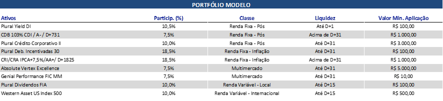 O Relatório Portfólio Modelo foi desenvolvido por um time de especialistas que levam em consideração diversos fatores econômicos, para facilitar o investidor no processo de construção de uma carteira de investimento diversificada e alinhada à sua tolerância de risco.
