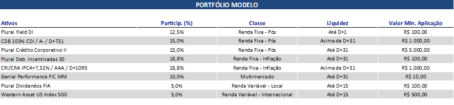 O Relatório Portfólio Modelo foi desenvolvido por um time de especialistas que levam em consideração diversos fatores econômicos, para facilitar o investidor no processo de construção de uma carteira de investimento diversificada e alinhada à sua tolerância de risco.