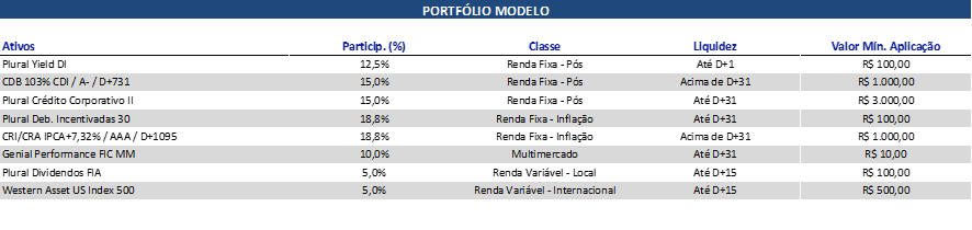 O Relatório Portfólio Modelo foi desenvolvido por um time de especialistas que levam em consideração diversos fatores econômicos, para facilitar o investidor no processo de construção de uma carteira de investimento diversificada e alinhada à sua tolerância de risco.