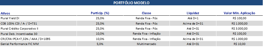 O Relatório Portfólio Modelo foi desenvolvido por um time de especialistas que levam em consideração diversos fatores econômicos, para facilitar o investidor no processo de construção de uma carteira de investimento diversificada e alinhada à sua tolerância de risco.