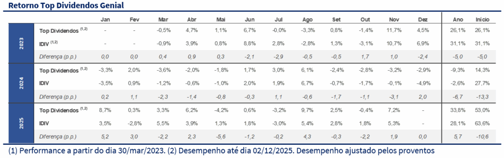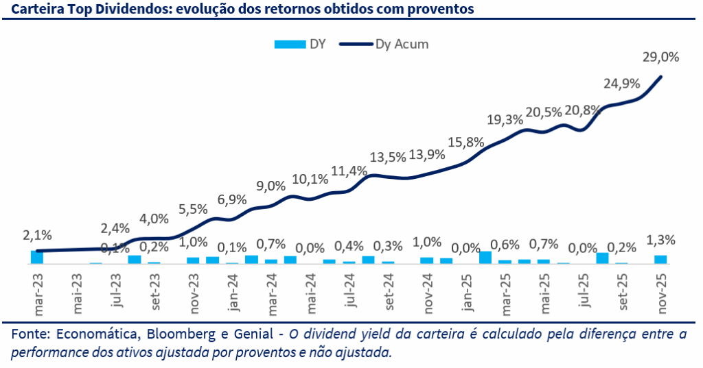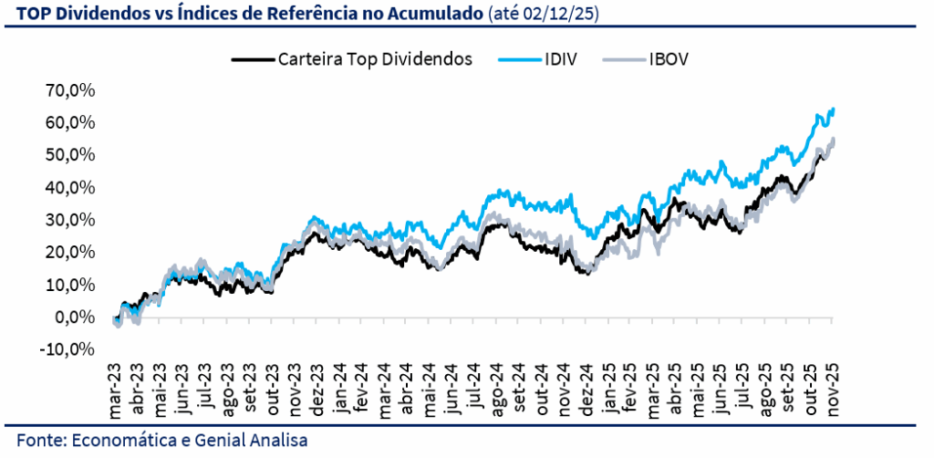 A Carteira Top Dividendos encerrou novembro com alta de 7,2%, superando novamente os principais índices de referência — Ibovespa (+6,4%) e IDIV (+5,3%) — e registrando o terceiro mês consecutivo de valorização. No acumulado de 2025, a carteira soma +33,8%, contra +32,2% do Ibovespa e +28,1% do IDIV, reforçando o bom desempenho relativo ao longo do ano. Desde o último rebalanceamento, a valorização chega a 5,1%, frente aos 3,7% do Ibov. Desde a criação, em março de 2023, o retorno acumulado é de 53,0%, com dividend yield total de 29,0% e média mensal de 0,8%, refletindo a consistência da estratégia.