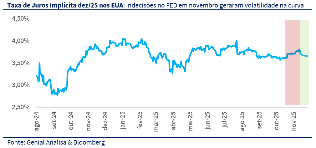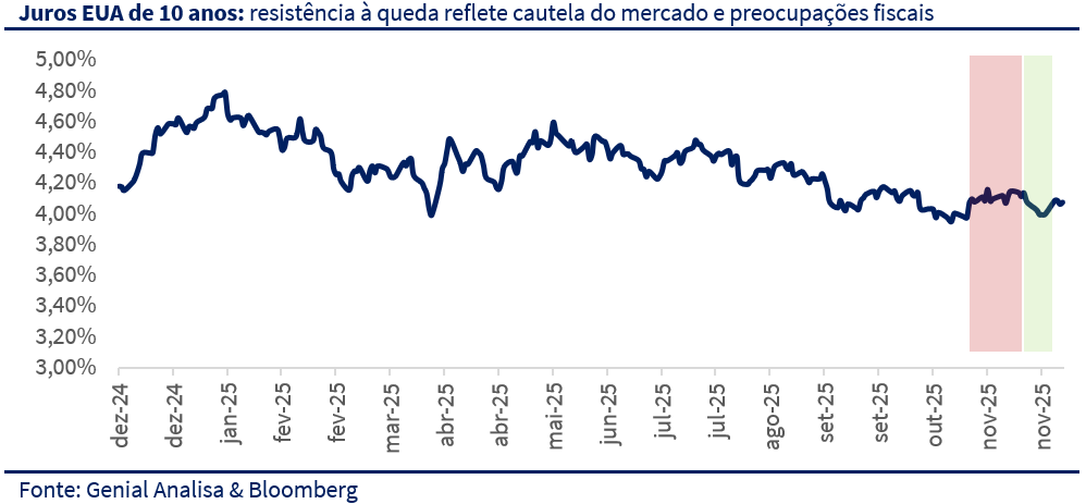 Por aqui, novembro começou com queda nas expectativas de inflação, mas também com crescente preocupação sobre a sustentabilidade fiscal e a capacidade do governo de cumprir metas estabelecidas no arcabouço. Mesmo com sinais positivos no mercado de trabalho, o ambiente doméstico seguiu pressionado por incertezas fiscais. Nesse contexto, o Copom manteve a Selic em 15%, enfatizando que a política monetária permaneceria restritiva enquanto o risco fiscal permanecesse elevado.