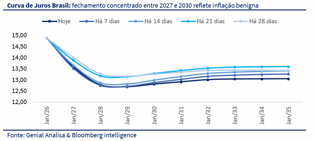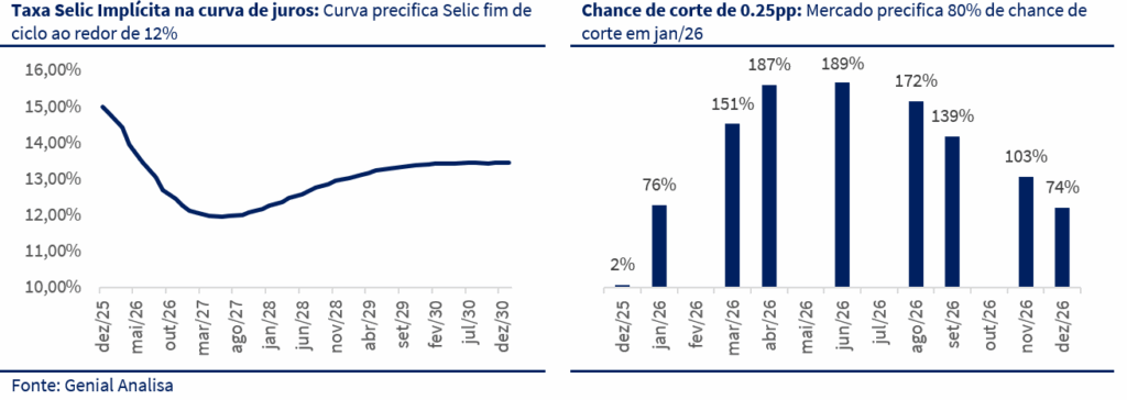 A precificação implícita na curva de juros aponta para um processo de flexibilização relativamente gradual, com a Selic atingindo seu nível mínimo próximo de 12% entre março e agosto de 2027, antes de voltar a subir levemente — movimento que faz o vértice final da curva se estabilizar ao redor de 13,5%. Com o cenário externo mais favorável, já vemos a própria Selic implícita na curva de juros indicando esse movimento: embora o mercado chegue a precificar cerca de 80% de probabilidade de um primeiro corte já em janeiro, nossa avaliação é de que o BC tende a adotar uma postura mais cautelosa, iniciando o processo apenas no final do trimestre.