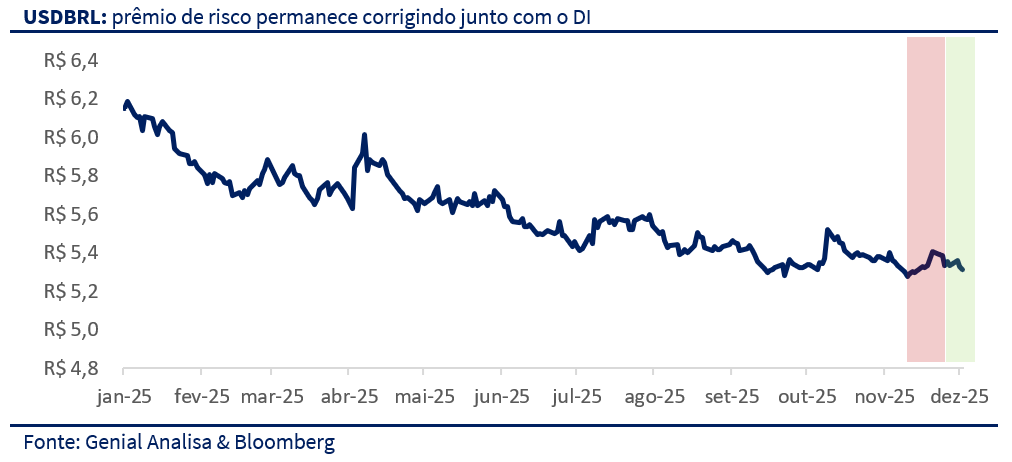 Por fim, a corrida das empresas para antecipação dos dividendos para preservar a isenção gerou preocupação de pressão sobre o câmbio. Porém, a decisão do Senado de ampliar para abril de 2026 o prazo para aprovar a distribuição de dividendos isentos reduziu a necessidade de concentrar pagamentos em dezembro, diminuindo a demanda imediata por dólar e aliviando a volatilidade cambial. Com o real mais estável e o ambiente global mais favorável, o mercado voltou a precificar início do ciclo de cortes no primeiro trimestre de 2026 — embora avaliemos que esse movimento tende a ocorrer mais adiante dentro do trimestre, caso os núcleos de inflação sigam resistentes.