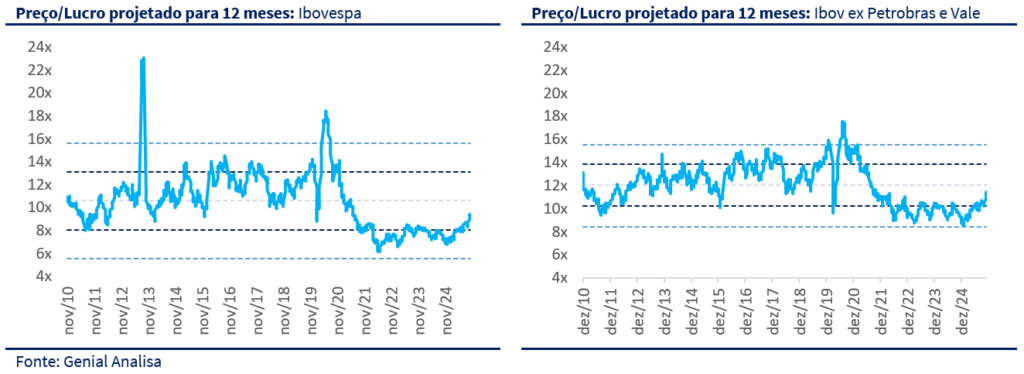Mesmo após o rali expressivo do ano, os preços seguem atrativos: o Ibovespa negocia a 9,4x P/L 12M, abaixo da média histórica de 10,6x. Ao excluir Petrobras e Vale — empresas que comprimem o múltiplo agregado — o índice vai para 11,1x, ainda inferior à média de 12,0x. Ou seja, a Bolsa segue barata de forma ampla e não concentrada em commodities, mas diluída entre setores domésticos, utilities, bancos e consumo.