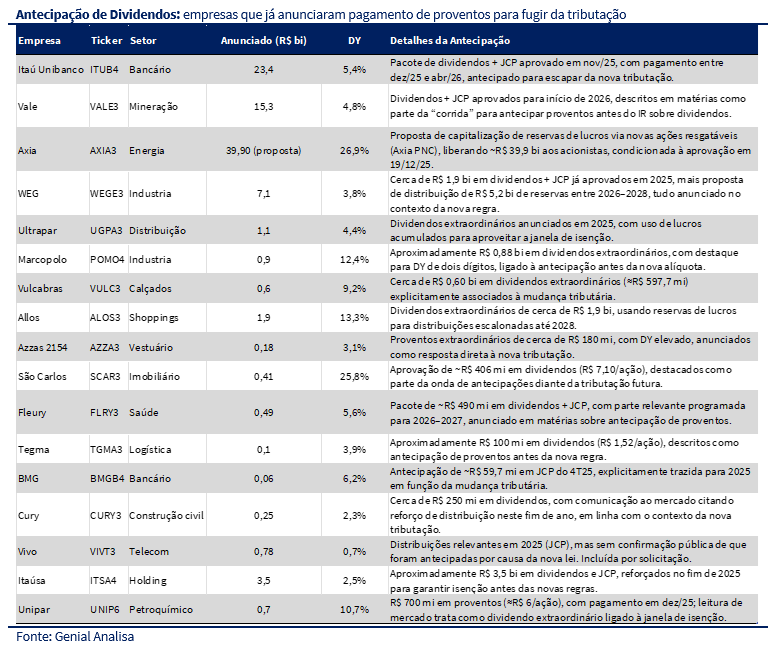 Como resultado, diversas empresas anteciparam o pagamento de proventos ainda para 2025 — numa “corrida contra o relógio” para preservar a isenção que vigia até 31/12/2025.
