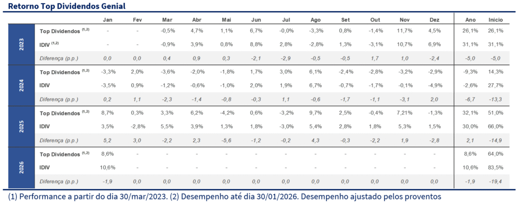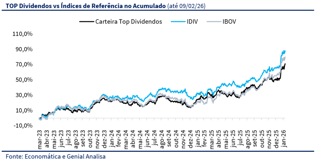 A Carteira Top Dividendos avançou +8,6% no mês, em um janeiro de forte alta para o mercado acionário brasileiro, mas com desempenho inferior ao Ibovespa (+12,6%) e ao IDIV (+10,6%). No acumulado do ano, a carteira também soma +8,6%. Desde o último rebalanceamento, a estratégia registra alta de +14,3%, acima do Ibovespa (+13,1%) e do IDIV (+13,4%). Desde o lançamento, em março de 2023, a rentabilidade acumulada alcança +70,8%, reforçando a consistência da estratégia ao longo do tempo.