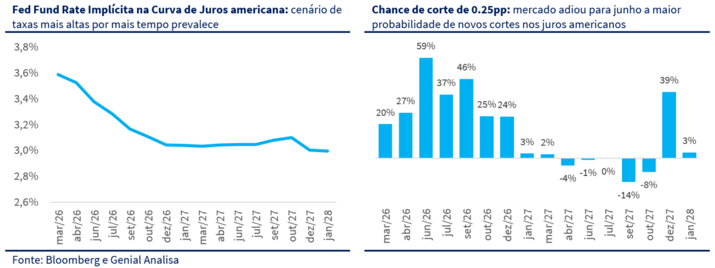 Na sequência, as leituras mais benignas de inflação de preços e ao produtor foram relativizadas pela distorção causada pelo shutdown. O ponto central passou a ser institucional, com novos ataques de Trump ao presidente do banco central americano Jerome Powell, elevando o ruído político e reacendendo o debate sobre independência do Fed. Após a normalização da divulgação de dados, a leitura de que não havia urgência para cortes foi reforçada.