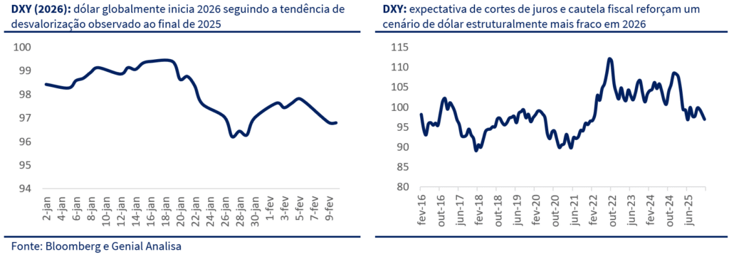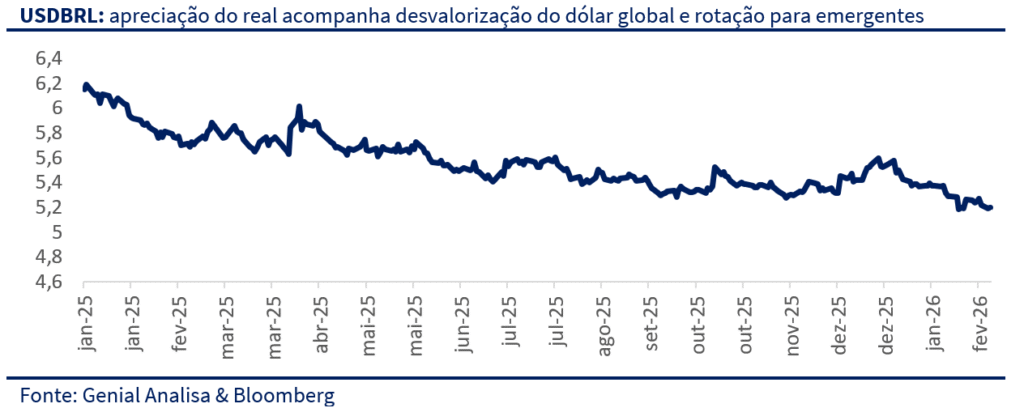Janeiro foi um mês excelente para o mercado de ações no Brasil e, em certa medida, representou uma versão mais intensa do movimento observado no segundo semestre de 2025 — marcado pela tese de desdolarização e por um dólar globalmente mais fraco, com rotação de fluxo para emergentes e ativos reais. A diferença é que, no início de 2026, essa dinâmica ganhou tração adicional à medida que novos ruídos e choques reforçaram o incentivo à diversificação fora dos EUA.