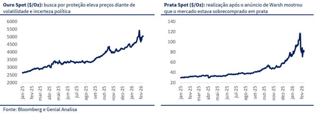 Em paralelo, episódio envolvendo Groenlândia elevou o risco de escalada comercial, adicionando volatilidade a bolsas e preços de energia/metais. Os episódios contribuíram para um movimento de “vender EUA” na margem, com busca por proteção (ouro/metais em máxima) e uma perda de força do dólar. Na reta final do mês, a manutenção de juros pelo Fed veio acompanhada de uma comunicação hawkish na margem, reforçando a ideia de “higher for longer”. Em paralelo, a indicação de Kevin Warsh como próximo presidente introduziu uma ambiguidade importante. Até então, parte dos investidores trabalhava com a hipótese de que Trump poderia escolher um nome mais leniente com a inflação, houve inclusive especulação em torno de Kevin Hassett, visto como mais próximo do núcleo político da Casa Branca, o que reforçaria o risco de ingerência e a expectativa de juros mais baixos à frente. A escolha de Warsh, por outro lado, foi lida como um sinal de maior credibilidade anti-inflação. O efeito prático foi um ajuste tático de posicionamento, com realização em ativos mais consensuais e interrupção temporária do movimento pró-emergentes.