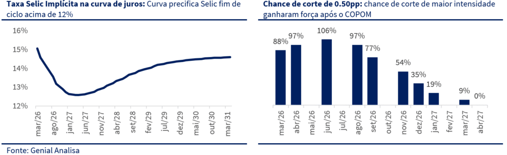 Na reta final, contas externas ajudaram a sustentar a leitura mais construtiva e o Copom manteve a Selic em 15%, mas com inflexão relevante no comunicado, introduzindo um forward guidance mais explícito para corte já em março (e deixando a magnitude em aberto). Com isso, a discussão doméstica deixou de ser “se corta” e virou “quanto corta” — com março como cenário-base, condicionado à evolução de serviços e ao ruído fiscal/político típico de pré-eleição.