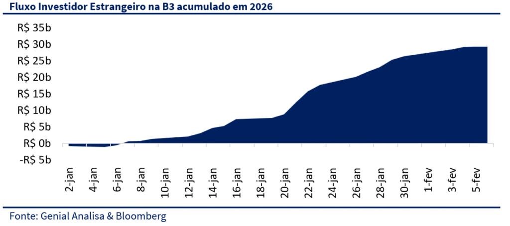 Em um janeiro o Ibovespa subiu 12,6%. O ponto mais importante para explicar a dinâmica de preços aqui foi justamente a entrada de recursos estrangeiros na B3, totalizando R$ 26,3 bilhões. Monitorando os volumes negociados na corretora, o AUM de ETFs e fundos de mercados emergentes observamos que a maior parte da alocação chegou, via basket (índice/ETF como EWZ e cestas setoriais/temáticas), o que naturalmente concentra impacto nas ações com maior liquidez e maior peso relativo nas cestas. Por isso, a “primeira pernada” do rali tende a favorecer grandes capitalizações — inclusive comodities, bancos e empresas de utilidades básicas.