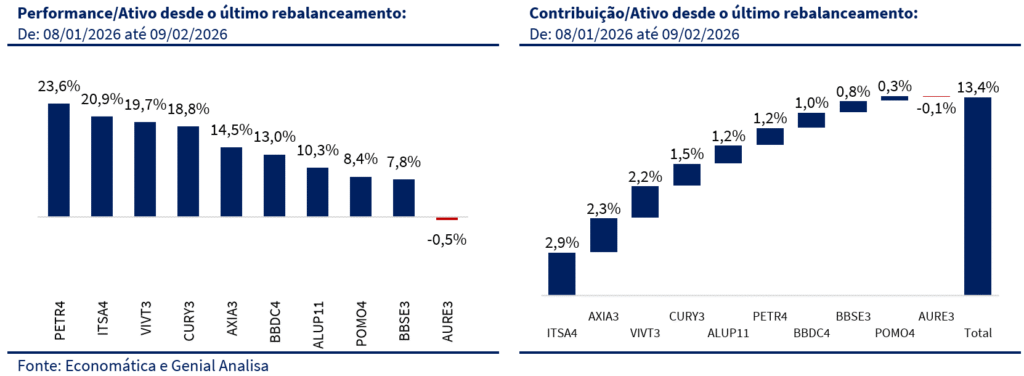 Desde o último rebalanceamento, os principais destaques positivos vieram de PETR4 (+23,6%), ITSA4 (+20,9%) e VIVT3 (+19,7%). Em termos de contribuição, ITSA4 liderou com +2,9 p.p., seguida por AXIA3 (+2,3 p.p.) e VIVT3 (+2,2 p.p.), refletindo um desempenho positivo relativamente bem distribuído entre os nomes do portfólio. Na outra ponta, AURE3 (-0,5%) foi o único papel com contribuição marginalmente negativa (-0,1 p.p.) no período.