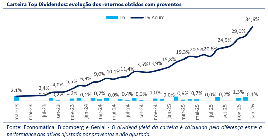 A Carteira Top Dividendos avançou +8,6% no mês, em um janeiro de forte alta das bolsas emergentes, mas com desempenho inferior ao Ibovespa (+12,6%) e ao IDIV (+10,6%). O período foi marcado por uma rotação global relevante de portfólios, com fluxo migrando para emergentes e ativos reais. A narrativa de dólar mais fraco ganhou força a partir de três vetores: (i) maior ruído em torno da condução da política monetária nos EUA e da trajetória dos juros longos; (ii) escalada de tensões geopolíticas; e (iii) busca por diversificação fora do mercado americano. Esse pano de fundo sustentou uma entrada expressiva de capital estrangeiro na B3 e contribuiu para a performance dos ativos de risco locais.