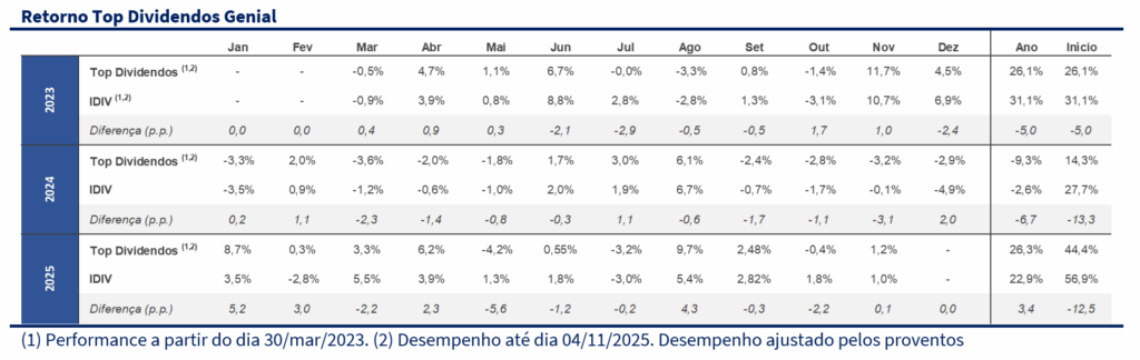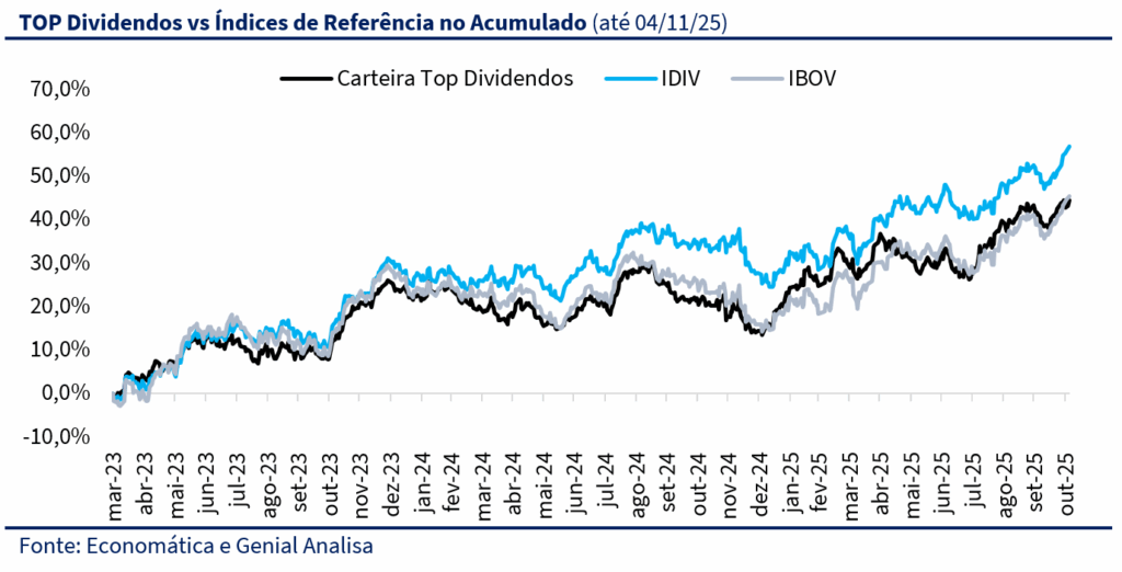 A Carteira Top Dividendos encerrou outubro praticamente estável, com queda de 0,4%, após dois meses consecutivos de valorização. No acumulado de 2025, a carteira registra alta de 26,3%, superando novamente os principais índices de referência (IBOV +25,3%; IDIV +22,9%). Desde o último rebalanceamento, em setembro, o portfólio acumula ganho de 4,7%, acima do Ibovespa (+4,1%) e do IDIV (+2,4%). Desde a criação, em março de 2023, a valorização acumulada é de 44,4%, com dividend yield total de 25,6% e média mensal de 0,7%.