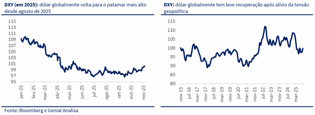 Ainda assim, o pano de fundo é de uma economia americana mais forte do que o esperado, sustentada pelo consumo, acordos comerciais recentes e aumento de arrecadação após as tarifas. O desafio permanece na ancoragem das expectativas: as projeções de inflação de longo prazo ainda estão acima de 3%, o que exige cautela do Fed para não perder credibilidade. Olhando para frente, o mercado externo deve operar com menos ruído até o fim do ano, mas o foco permanece sobre o DXY. Uma nova rodada de fortalecimento do dólar poderia reacender a aversão a risco e pressionar moedas emergentes.