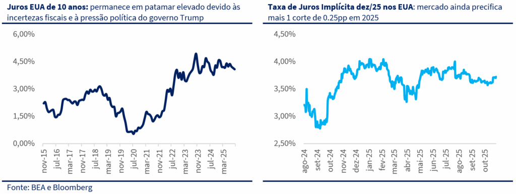 Os juros de 10 anos seguem em patamar elevado, refletindo as incertezas fiscais e a pressão política do governo Trump. Ainda que precifique mais um corte de juros em 2025 de magnitude semelhante, após as falas duras do presidente e divisão entre os membros do FED, vimos um leve movimento de correção na taxa implícita para dezembro de 2025.