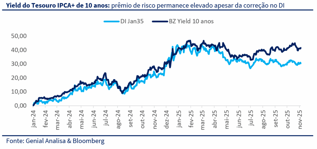 No Brasil, o debate fiscal voltou ao centro das atenções após a rejeição da MP 1303 e a sinalização de estímulos com viés eleitoral, como o novo crédito imobiliário de R$ 20 bilhões e a ampliação da faixa de isenção do Imposto de Renda. Mesmo assim, o mercado reagiu positivamente ao ambiente inflacionário mais benigno: a curva de juros fechou de forma expressiva, refletindo a queda das expectativas de inflação de curto prazo e a percepção de que o juro real elevado continua ancorando as projeções. Esse movimento consolidou a visão de que o Banco Central pode iniciar o ciclo de cortes já no começo de 2026.