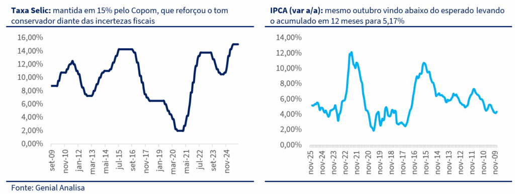 Para conter parte da pressão e mirando 2026, o governo anunciou medidas de estímulo com foco eleitoral, como a criação de um novo modelo de crédito imobiliário de R$ 20 bilhões e a ampliação da faixa de isenção do Imposto de Renda. Do lado da economia real, o setor de serviços manteve crescimento sólido, sustentado por renda e mercado de trabalho fortes — o que reforçou a leitura de que o Banco Central deve manter a política monetária rígida por mais tempo. Na frente de preços, o IPCA e o IPCA-15 vieram abaixo do esperado favorecidos pela constante queda do petróleo e a valorização do real que ajudaram a conter a inflação.