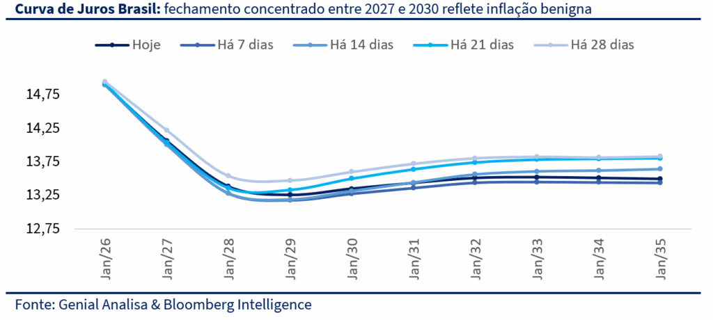 Mesmo com o ruído fiscal, o mercado reagiu ao alívio inflacionário observado ao longo de outubro. A combinação de inflação abaixo do esperado, valorização do real — sustentada pelo carrego elevado com juros reais acima de 10% — e a queda do petróleo trouxe um movimento consistente de fechamento da curva de juros, especialmente nos vértices intermediários. Como mostra o gráfico abaixo, a curva recuou de forma expressiva em relação às semanas anteriores, refletindo a revisão das expectativas de inflação de curto prazo e consolidando a visão de que o Banco Central poderá iniciar o ciclo de cortes da Selic já no início de 2026.