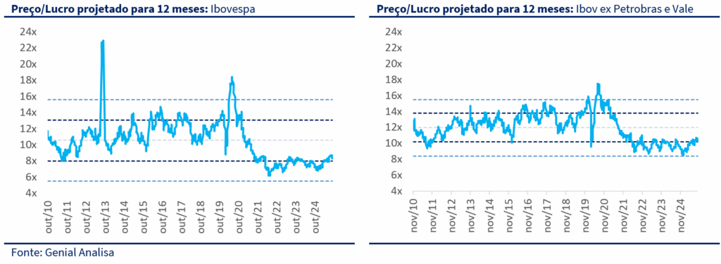 Em termos de valuation, o Ibovespa é negociado a 8,7x o lucro projetado para os próximos 12 meses (P/L 12M), patamar ainda abaixo da média histórica de 11,5x–12,0x. Quando excluímos Petrobras e Vale, o múltiplo sobe para 10,6x, também inferior à média de 12,0x — o que mostra que o mercado segue descontado, mesmo após três meses de recuperação. Esse desconto, aliado à queda nas taxas futuras, reforça o potencial de reprecificação dos ativos domésticos no médio prazo.
