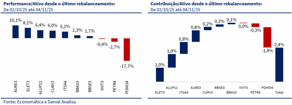 Outro destaque foi Eletrobras (ELET3), que subiu +8,1% e adicionou +1,0 p.p. à performance da carteira. Além da expectativa de uma política de dividendos mais robusta, o papel foi impulsionado pela venda da participação na Eletronuclear, que representa um movimento estratégico de desalavancagem e simplificação do portfólio, liberando cerca de R$ 5 bilhões em garantias e reduzindo riscos associados ao projeto de Angra III. O mercado interpretou o evento como um passo relevante no processo de “de-risking” da companhia e melhora na alocação de capital — fatores que reforçam a atratividade da tese no médio prazo.
