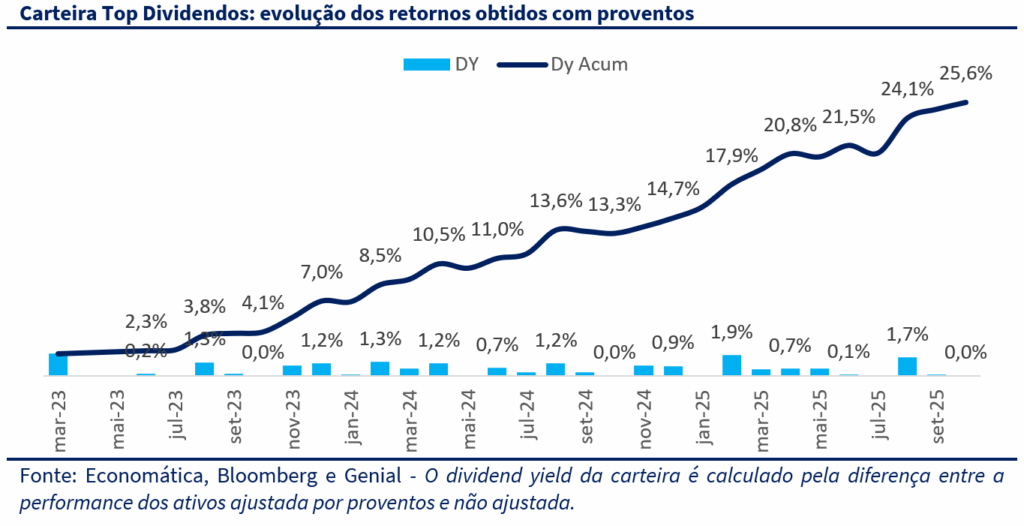 A Carteira Top Dividendos encerrou outubro com leve queda de -0,4%, enquanto o Ibovespa subiu 2,3% e o IDIV avançou 1,8%. Mesmo com o desempenho negativo no mês, a carteira acumula alta de 26,3% em 2025, mantendo ampla vantagem frente ao IDIV (+22,9%) e ao Ibovespa (+25,3%). O resultado reflete a resiliência das posições de perfil defensivo, em especial nas elétricas e financeiras, que compensaram parte da realização observada em papéis mais cíclicos. A dinâmica de dividendos segue consistente: mesmo sem grandes pagamentos em outubro, o dividend yield acumulado desde março de 2023 já atinge 25,6%, com média mensal de 0,7%. A carteira mantém seu papel de geração recorrente de renda, combinando retorno absoluto robusto com menor volatilidade relativa ao índice.