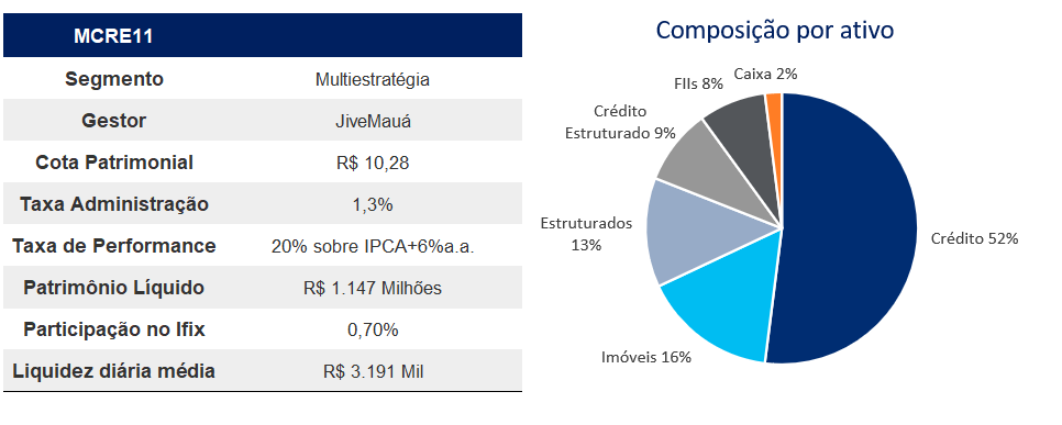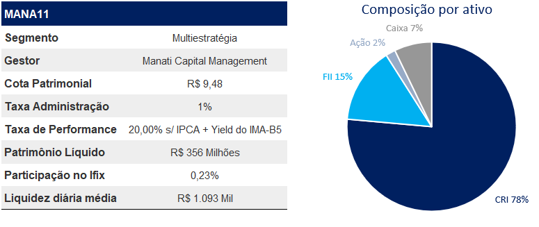 No que tange à composição, incluímos o MANA11, hedge fund da Manatí Capital. A consistência na execução das estratégias e a versatilidade do fundo em transitar por diferentes classes de Real Estate foram fatores decisivos. Além disso, enxergamos um forte alinhamento com os cotistas por meio da estruturação e originação própria de CRIs.