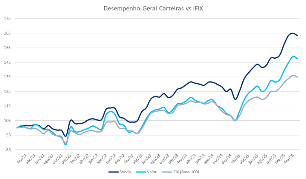 Já a carteira valor teve performance de -1,12%, em comparação a –0,91% do IFIX.