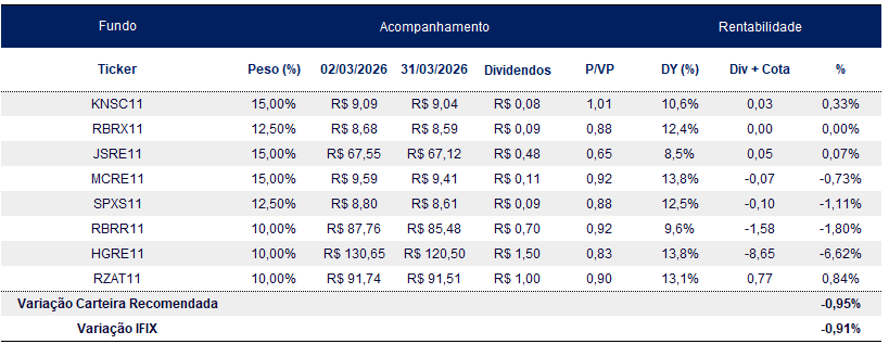 No mês de março a Carteira Renda teve performance de -0,95%, em comparação a -0,91% do IFIX.