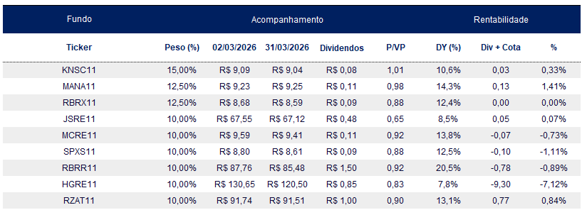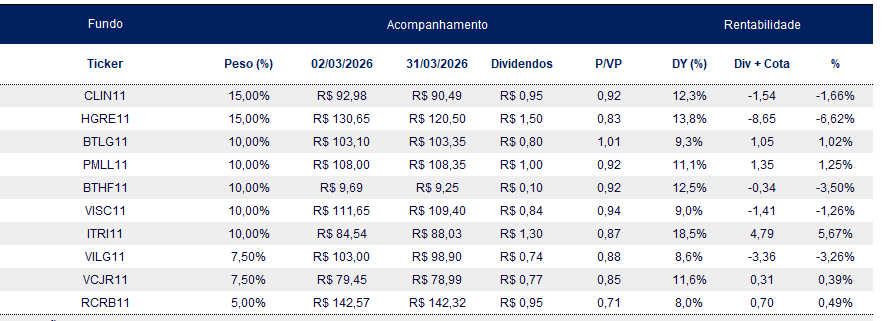 Em março, o desempenho da carteira ficou abaixo do IFIX, reflexo de um cenário marcado pela revisão das expectativas de cortes de juros. Contudo, reiteramos nossa confiança na qualidade dos ativos e optamos por manter a tese central do portfólio, realizando apenas ajustes pontuais no rebalanceamento das exposições.