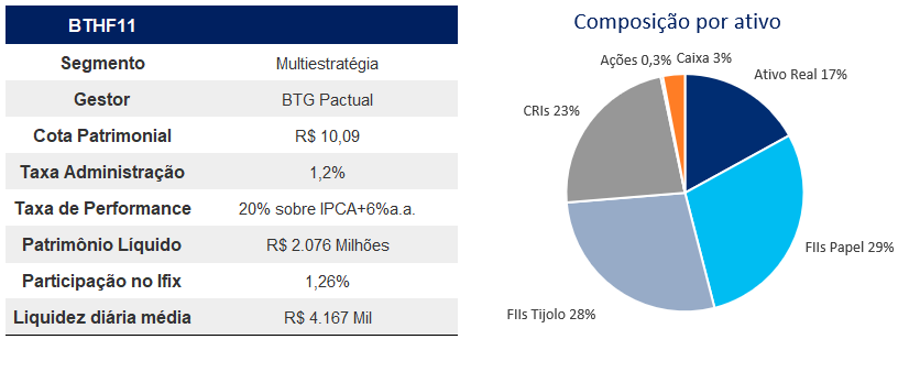 Anteriormente negociado no ambiente Cetip, o BTHF realizou uma fusão com o BCFF no final do ano de 2024, sendo então listado na B3 e tendo os ativos do antigo FoF do BTG incorporados. De maneira geral, gostamos da carteira do fundo, tanto no que tange aos CRIs, aos FIIs e ativos reais. Entendemos que ele possui diversificação suficiente para dispersar riscos de inadimplência e concentração satisfatória para possibilidade de geração de alpha.
