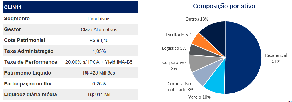 O fundo está com 83,8% do seu PL alocado, principalmente em CRI e FII, com 69% das operações com garantias no estado de São Paulo. O fundo mantém 90% do PL indexado a IPCA+10,6% (MTM) com duration de 4,1 anos, e 9% do PL a CDI+5,5% (MTM) com duration de 4,1 anos. As 3 maiores alocações setoriais da carteira se dividem em residencial, varejo e energia. Suas maiores posições são os CRIs Matarazzo e JFL Jardins.