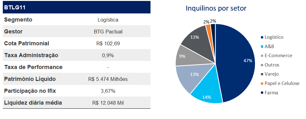 Fundo de logística do BTG Pactual que tem como objetivo obter renda e ganho de capital por meio da exploração de empreendimentos logísticos. O BTLG11 possui 1,4 milhões m² de ABL em 33 imóveis com maior concentração no estado de São Paulo e Minas Gerais.
