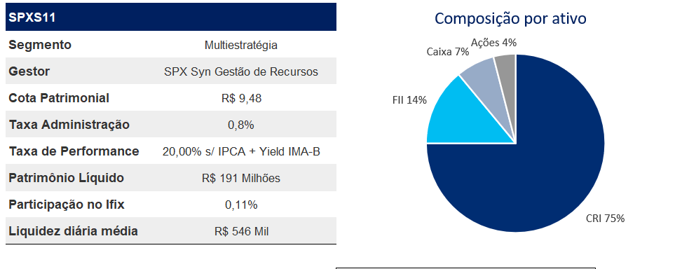 Fundo multiestratégia da SPX SYN Gestão de Recursos que tem objetivo obter rendimentos e/ou ganho de capital por meio de um mandato mais amplo de investimentos, como em CRIs, ações imobiliárias, cotas de FII e ativos reais. O portfólio de ativos contempla 74% em CRIs, 13% em FIIs, 9% em Caixa, e 3% em Ações. A estratégia atualmente está alocada em ativos geração de renda (93%), ganho de capital (4%) e o restante em ativos com perfil renda e ganho de capital (3%). O spread médio da carteira de CRIs representa IPCA+10% e CDI+4,5%.