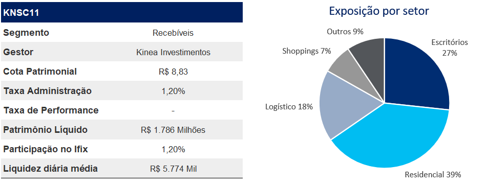 Fundo da Kinea que tem como objetivo investir em CRIs com boa relação de risco retorno indexados tanto à IPCA quanto ao CDI. As duas maiores alocações por setor concentram no setor de escritórios e o residencial.