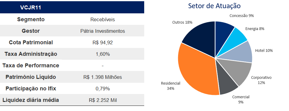 Fundo de recebíveis da Pátria que aplica em CRIs, LCIs, LHs e outros ativos financeiros imobiliários. O VCJR11 paga rendimentos mensais a seus cotistas e busca acompanhar a rentabilidade da NTN-B + 1% a 3% a.a.