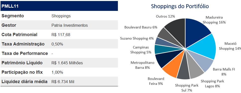 Antigo fundo de Shopping Center da Genial Gestão, que por sua vez foi adquirido pelo Patria, que tem como objetivo a aquisição de ativos performados, resilientes e com dominância regional. Atualmente seu portfólio é composto por 14 ativos totalizando 139 mil de ABL, distribuídos em 6 estados, com presença majoritária no Sudeste e Nordeste.