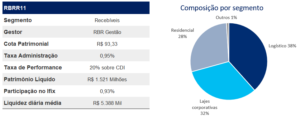 O RBRR11 é o fundo imobiliário de papéis High Grade da RBR Asset Management. Seu objetivo é investir em papéis com boa qualidade de crédito e boas garantias. Sua carteira de CRIs é composta por 110 ativos: 99% indexado à inflação, com taxa MTM de IPCA+9,2%, apresentando duration médio de 4,1 anos e LTV de 50%. Sua carteira é composta por devedores com boa qualidade de crédito como Brookfield, Rede D’Or e LogCP. Vale destacar que 40% das garantias estão localizadas em regiões prime.