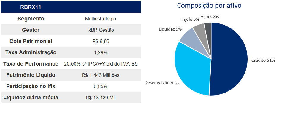 Fundo multiestratégia da RBR Asset que tem como objetivo investir de forma diversificada em crédito, desenvolvimento imobiliário, tijolo e ações. O portfolio tem 58,8% em FIIs, 38,8% em CRIs, e o restante distribuidos em SPE, imóveis e caixa.