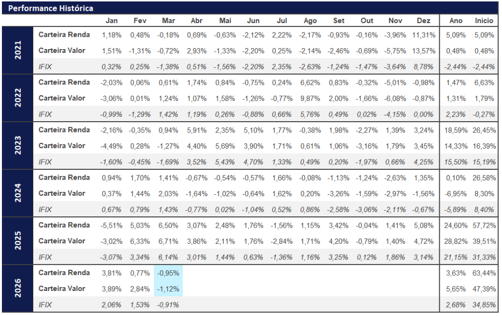 Embora nossas carteiras mantenham retornos superiores ao IFIX no acumulado do ano, o mês de março apresentou desafios que comprimiram os resultados. Reiteramos nossa confiança na qualidade dos ativos selecionados e acreditamos que a manutenção do atual mix entre papel e tijolo é a estratégia ideal para navegar o cenário de incerteza.