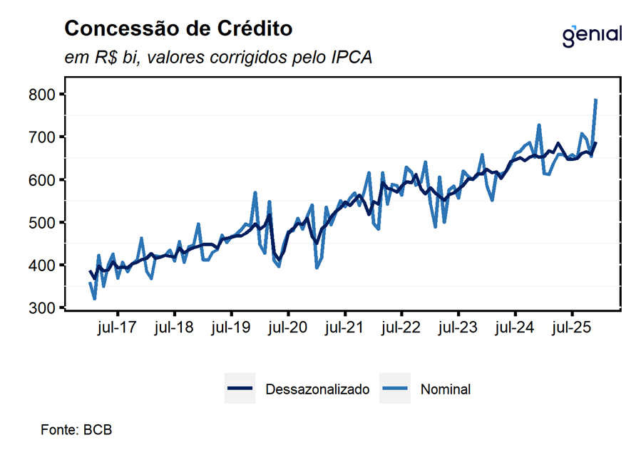 De modo geral, os dados de crédito de dezembro permanecem compatíveis com o atual estágio de aperto monetário, sugerindo uma trajetória de arrefecimento na comparação com 2025. Ainda assim, avaliamos que o mercado de crédito segue resiliente, com expansão interanual ainda robusta. A nosso ver, esse desempenho reflete sobretudo o descasamento entre as políticas monetária e fiscal, que tem sustentado uma resiliência da atividade acima do padrão mesmo diante de uma política monetária significativamente restritiva. Sob a perspectiva de afrouxamento do ciclo monetário ao longo dos próximos meses, esperamos que o mercado de crédito siga apresentando uma trajetória de arrefecimento bastante gradual, beneficiada por uma taxa de juros menos contracionista e um mercado de trabalho aquecido que, em conjunto da modalidade do consignado do setor privado, devem favorecer as concessões em 2026.