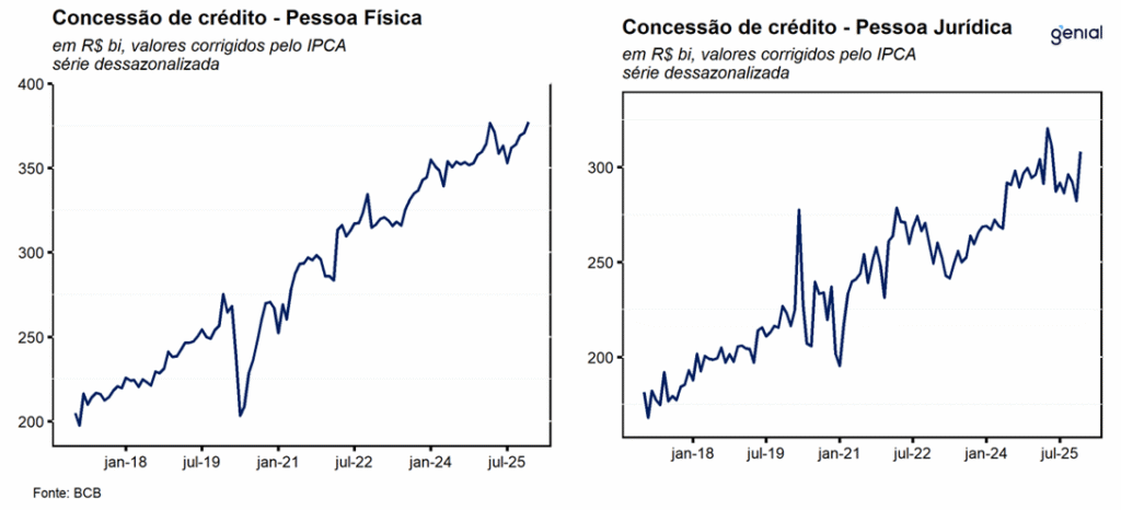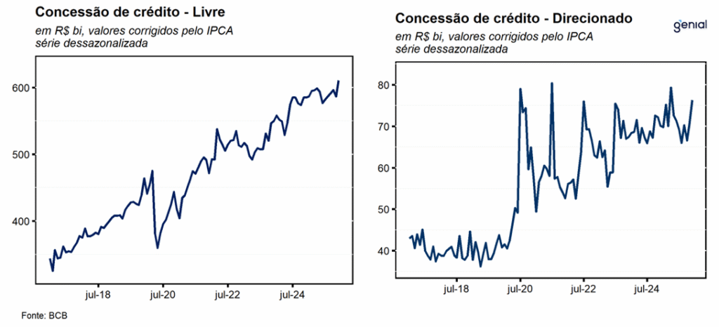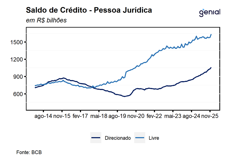 Para as pessoas físicas, as concessões livres, registraram expansão de 14,1% a/a em dezembro, a acelerando em relação aos 11,6% a/a registrados no mês imediatamente anterior. Os principais destaques, em termos reais, ficaram por conta dos desempenhos observados nas concessões de crédito consignado privado (418,5% a/a), que vem acelerando nos últimos meses em decorrência da entrada em vigor da MP 1292/25 do consignado privado para trabalhadores celetistas; e cartão de crédito (10,7% a/a), acelerando pelo quarto mês consecutivo e reflete as leituras robustas de todas as suas modalidades, com destaque para o segmento parcelado (26,7% a/a) e da forte aceleração do rotativo (de 2,0% a/a para 11,1% a/a) na passagem de novembro para dezembro. Na ponta negativa, destacamos as baixas de 9,8% a/a no consignado para trabalhadores do setor público, refletindo ao nosso ver os efeitos da política monetária contracionista sobre as concessões dessa modalidade, e de -18,5% a/a do crédito consignado dos beneficiários do INSS, que, na nossa opinião, é reflexo do escândalo recente envolvendo os descontos indevidos feitos nas aposentadorias dos beneficiários do INSS.